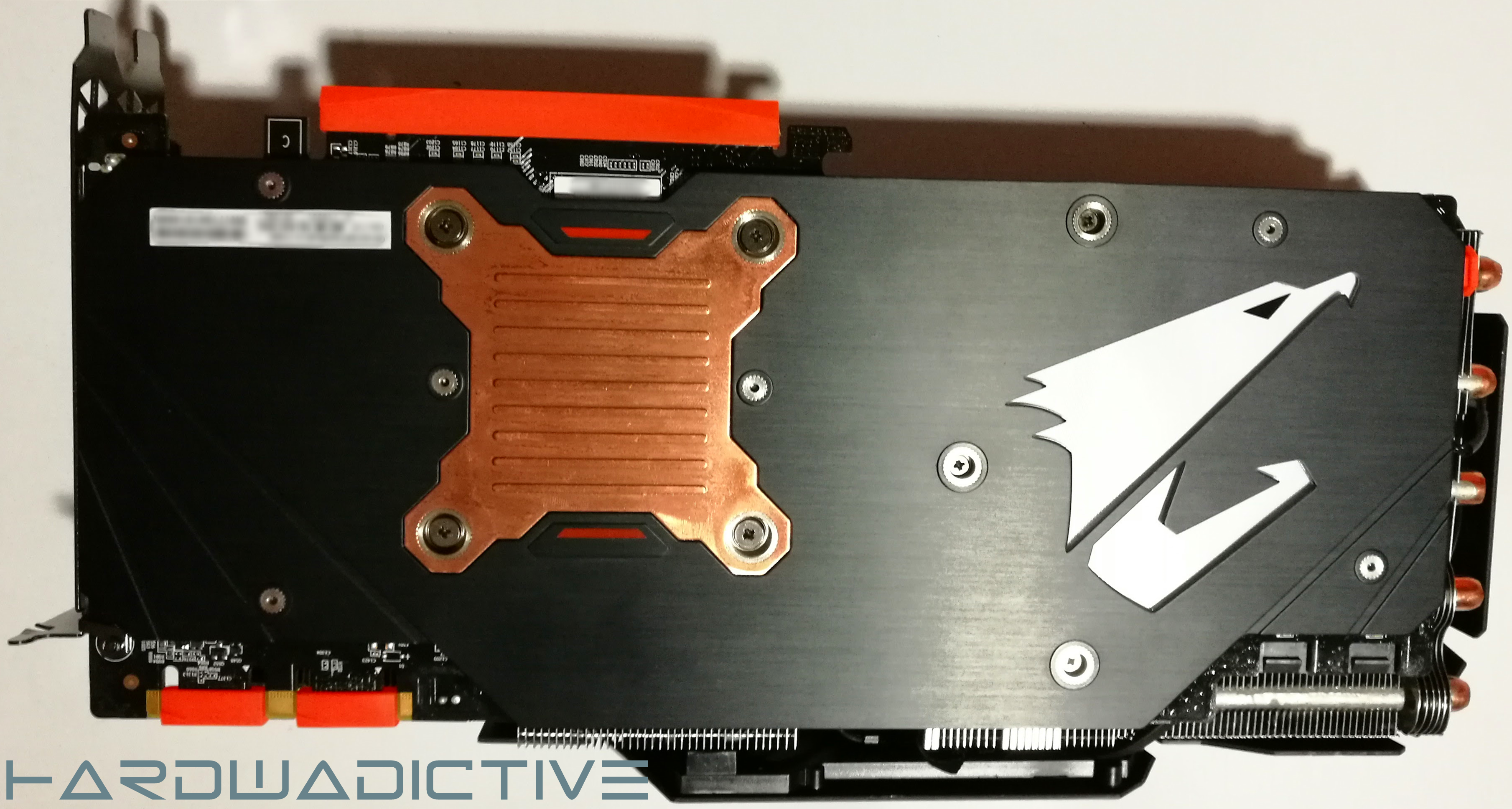 En su parte trasera tenemos su blackplate con el logo de Aorus, el cual no solo se encarga de mantener perfectamente rígida la tarjeta gráfica si no que además mejora su refrigeración al hacer contacto mediante una base de cobre colocada sobre la parte trasera del núcleo y sobre algunos componentes de sus sistema de alimentación mediante almohadillas.